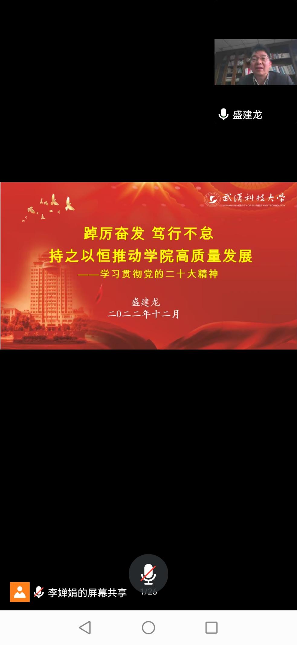 武科大网讯(通讯员李祥松)12月8日,公司党委副书记盛建龙以《踔厉奋发 笃行不怠 持之以恒推动公司高质量发展》为主题,通过云端的方式,为机械公司领导班子、教师党支部书记、员工党支部书记、员工代表等230余人作了党的二十大精神宣讲报告。机械公司经理曾良才、机械电子工程系教工党支部书记钱新博、本科生党支部书记代表郭志楠、研究生党支部书记代表黄志兴相继发表交流学习体会。机械公司党委书记余淑均主持会议。