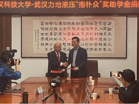 在与会人员的共同见证下,余淑均与朱明礼签署《“抱朴众”奖助学金捐赠协议》,朱明礼代表武汉力地液压设备有限公司向402cc永利官网赠送捐款支票牌,盛建龙代表公司向武汉力地液压设备有限公司颁发捐赠证书,并与朱明礼共同为“抱朴众-力地液压奖助学金捐赠单位”揭牌。