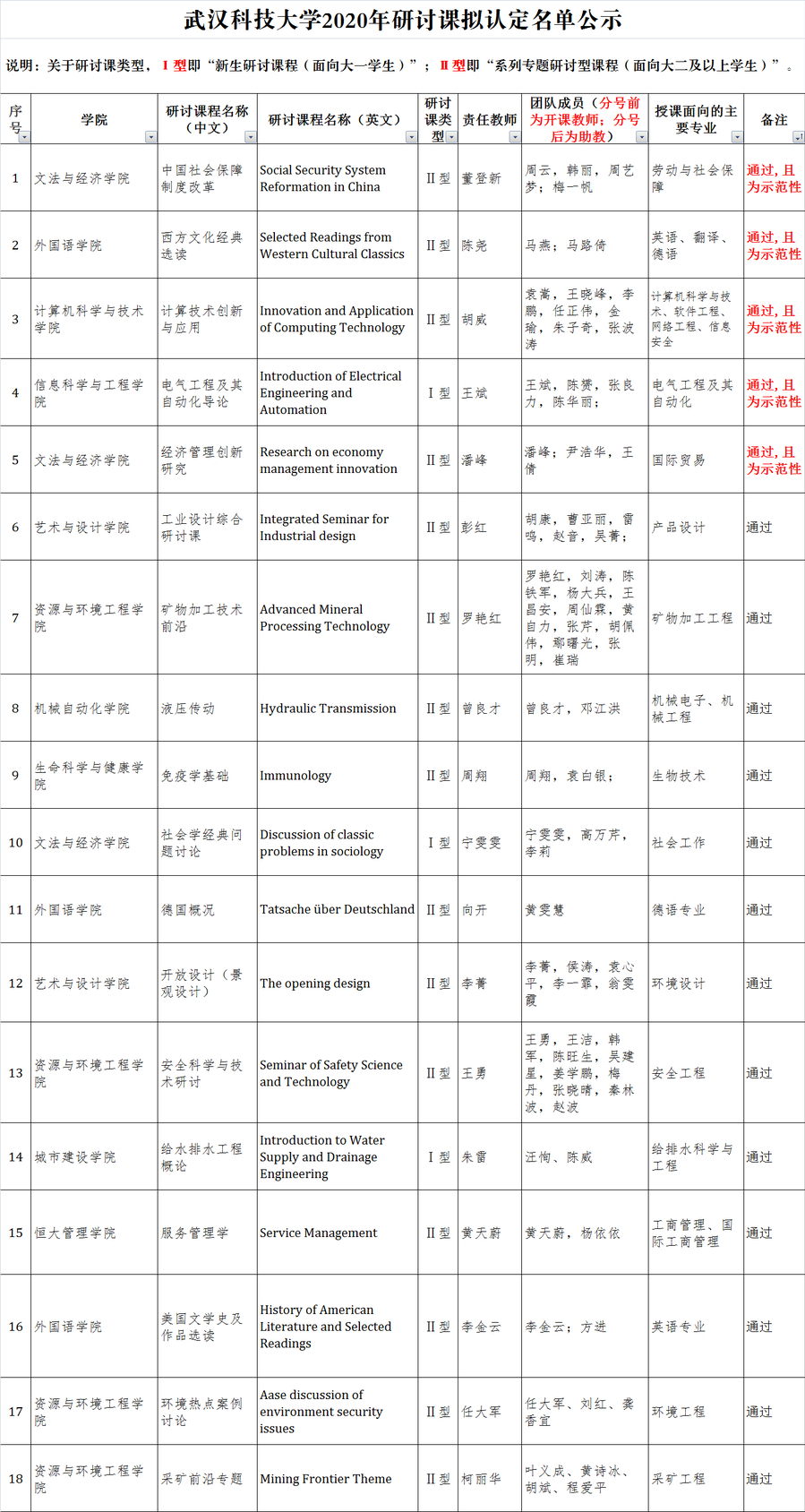 经各单位申报,教务处组织专家初评,校教学指导委员会评审通过,拟认定彭红为负责人的“工业设计综合研讨课”等18门课程为研讨课。其中,董登新为负责人的“中国社会保障制度改革”等5门课程为示范性研讨课,现予以公示。具体名单见附件。